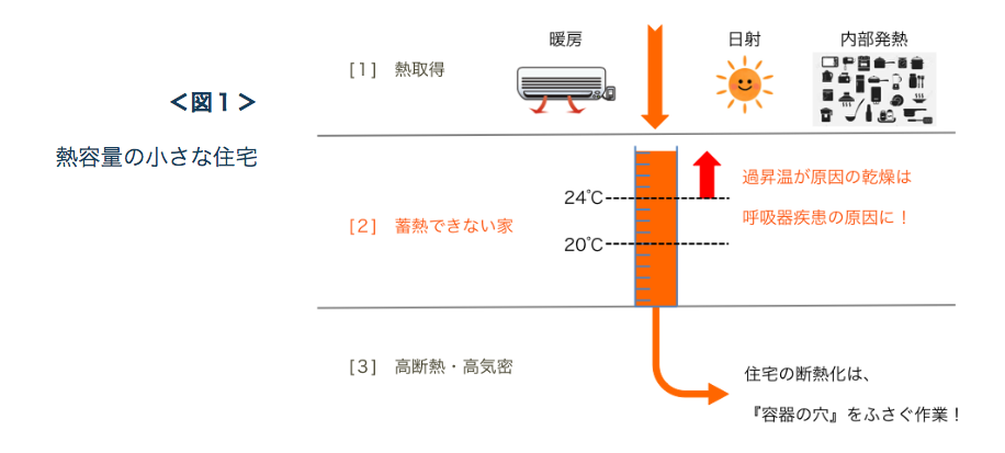 バケツの容量が小さいと晴天日に日射熱(水)が急激に供給された 時には、バケツの水位が思わぬ上昇をしてしまいます。断熱性能の 低い家では生じることがなかった「意図しない急激な室温上昇(過 昇温)」が生じ、これがきっかけで相対湿度が過度に低下してしま う原因になっているのです。