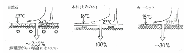 入浴時に脱衣室で裸足になった時、足裏からの熱の伝わり易さは床の仕上げ材 料によって異なります。下図でもわかるように、天然の石やタイル、コンクリ ートではカーペットの 10 倍以上の熱が足裏から急速に奪われます。