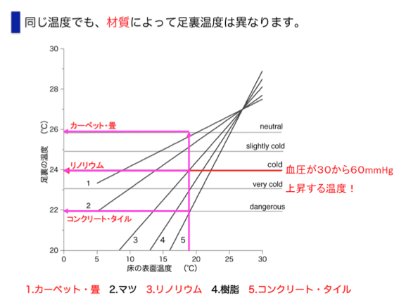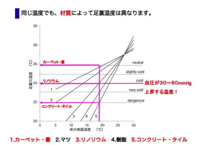 人間の足裏温度は通常 27°Cに保たれていますが、これが 24°Cになると血圧が 30 から 60mmHg も急上昇します。冷たい床によって足裏温度が 24°C以下に なる状況は、CPA 発生の危険信号と言えるでしょう!