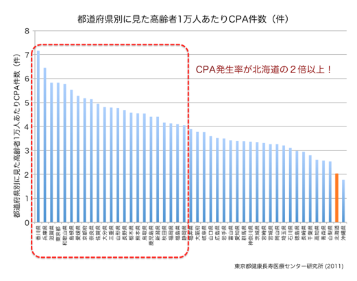 Lesson7で紹介した東京都健康長寿医療センター研究所の調べでは、北海道の高齢者1万人あたりのCPA発生率は、沖縄県に続いて全国ベスト2位!
