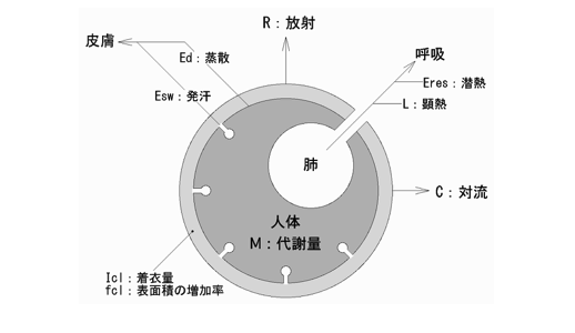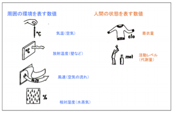 気温以外にも壁や床、天井の表面温度(放射温度)、隙間風やエアコンなどで生じた微弱な気流、相対湿度などが温冷感の因子として挙げられます。また、人間がどんな行動をしているのか(つまり代謝量の大小)や、着衣の質と量など、環境以外の因子も考慮する必要があります。