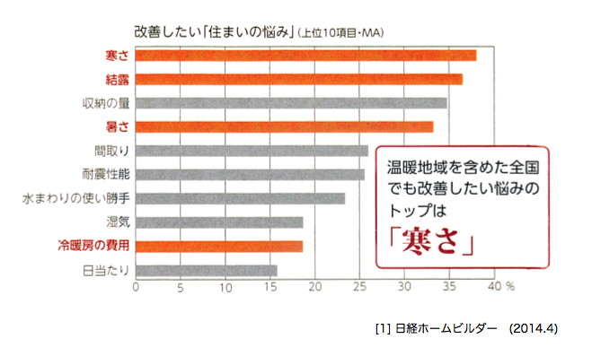 温暖地と言われる地域を含め、住まいの悩みの第1位は「寒さ」。