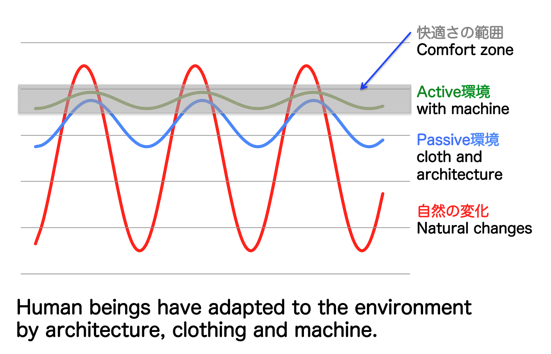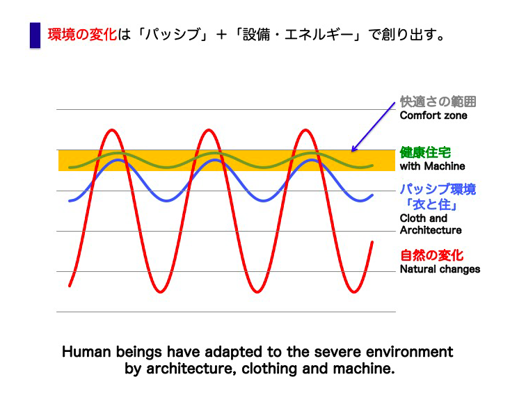 環境形成に欠かせない設備は、大きな能力を持つ機械を制御しながら使用して、環境を一定に保つといった設計思想が長い間支配してきました。一方で、断熱性能を高め設備の容量を小さめに設計すると室内環境の変動幅は相対的に増大し、快適環境の範囲内で自然の変動を再現できることも知られています。強大なパワーで自然をねじ伏せるのか?機械の力を最小限にとどめて、自然の変動を許容して共生するのか?どちらが人間にとって健康的なのでしょう?