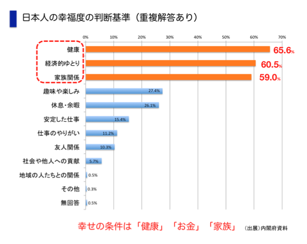 続いて「経済的なゆとり」「家族関係」が、ほぼ同率で続きます。