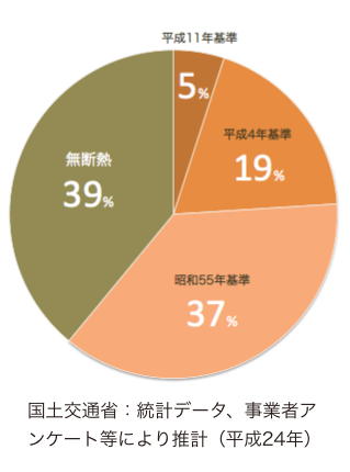 一方で、全国の断熱構法の普及は未成熟で、住宅ストック全体でいうと無断熱が約50%、現行法令に合致した住宅も全体の5%程度に過ぎません。