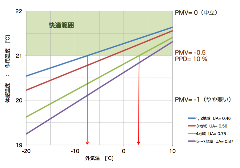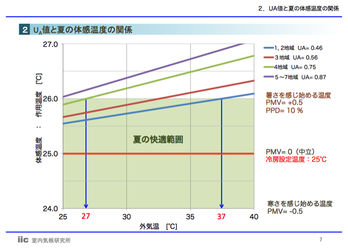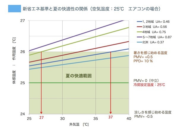 エアコンの設定温度を25℃にして連続運転したとしても、4地域(南東北、甲信地方)の基準断熱レベル(UA=0.75[W/m2/K])の住宅では、外気温度が27℃になると、室内にいる人は「暑さ」を感じ始めることがわかります(晴天で日射がある時)。