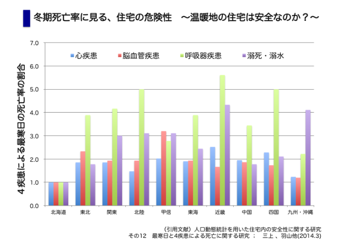 厚生労働省の統計によれば、毎年18,000人もの尊い命が住宅内のヒートショックによって失われています。交通事故が原因の死者数を大きく上回りますが、新聞などで報道されることが少ないせいか、この事実はあまり認識されていないようです。特に、居間とトイレ、脱衣室、浴室との温度差は脳血管疾患や心疾患との因果関係が指摘されており、早急な対策が必要かと思います。