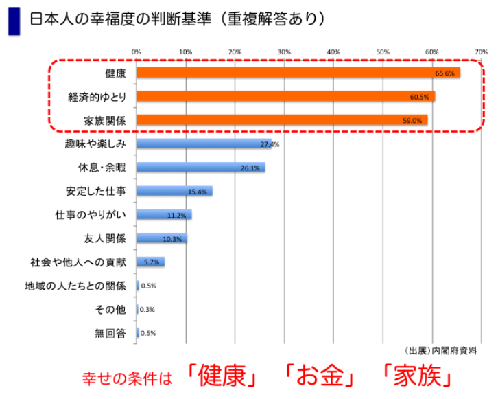 解答(重複解答あり)で第1位を占めたのは、「幸福のためには健康が第一」。およそ66%の日本人は「健康」が幸福の第一条件であると解答しました。