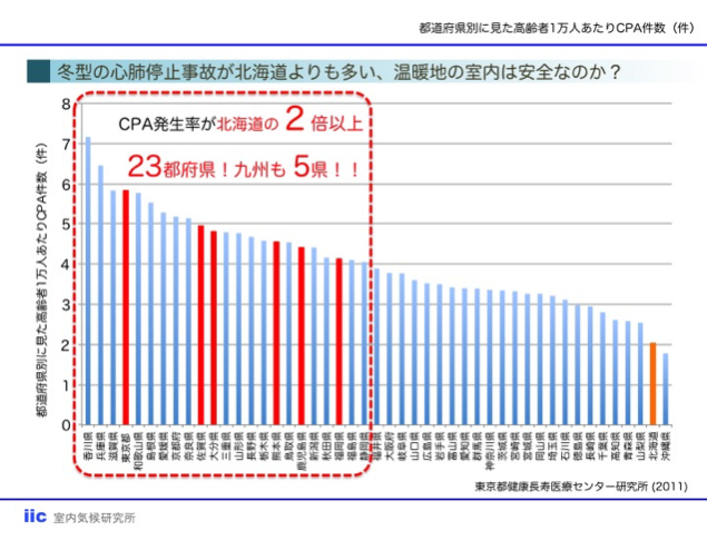 入浴中CPA発生頻度は季節性が明らかになっており、冬季は夏季の11倍もの事故が発生します。浴室の室温が低いとCPAに陥りやすいのです。どうして寒冷地北海道のCPAリスクは低いのでしょうか。