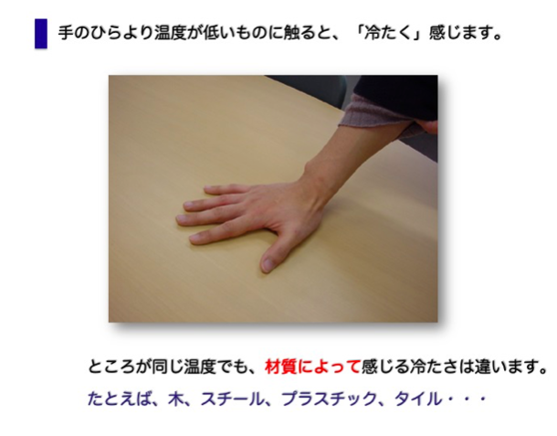 同じ温度の物体でも種類(熱伝導率)が違うと、暖かさには違いがあります。 木製デスクがスティールデスクより接触した時に暖かく感じられるのは、木の 熱伝導率(熱の伝わりやすさ)が金属よりも小さいからです。