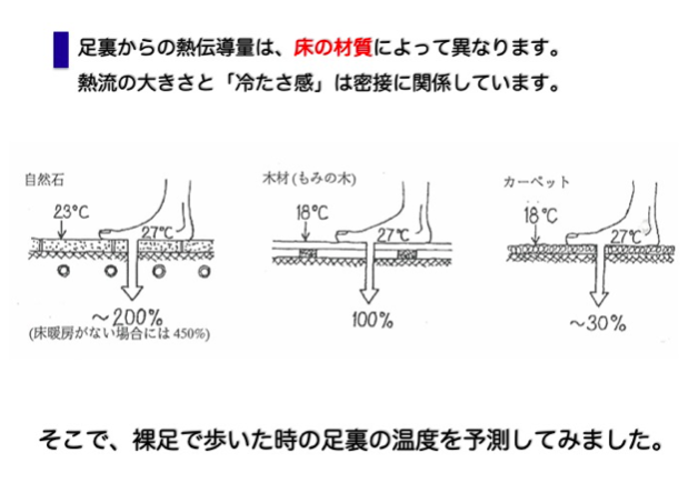 床の断熱が施され室温が十分に確保されている状態で、床に直接足を接触させ た時の足裏温度と床の材料との関係を計算した結果が下の図です。