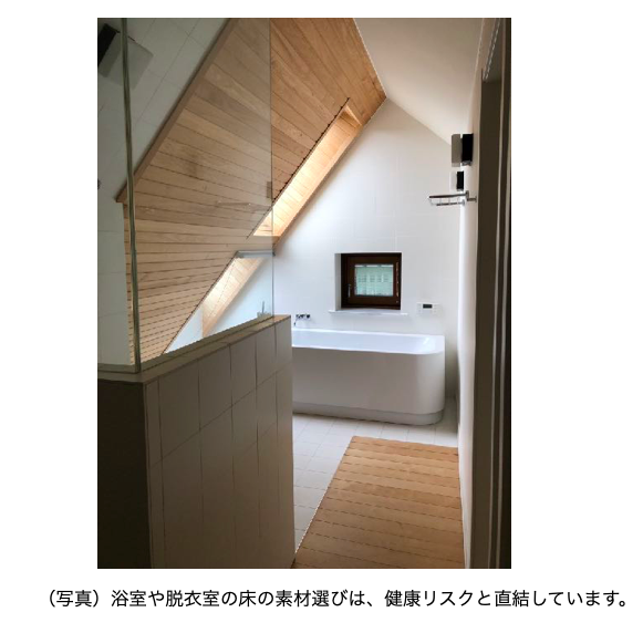 「断熱」に十分気をつけた住宅でも、床材の選択によっては CPA 発症のリスク が増加してしまうことを忘れてはいけません。老人と同居されているご家庭で は、トイレ、脱衣室周りの床にカーペットやラグ、畳表などを使用したり、ス リッパを常時着用したりすることが、健康を維持する上で大切なのです。