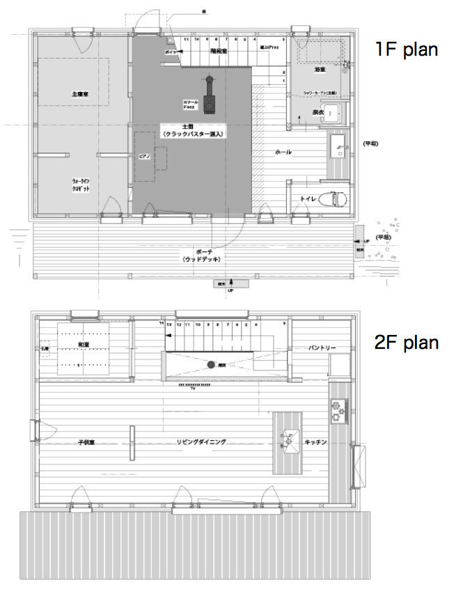 玄関土間をコアスパースにした1F のプランは、主寝室と浴室などの水回り空間が土間に連続し て配置されています。主暖房機である薪ストーブはこの土間空間に配置。階段室の吹抜けを利用 して暖気が2F にも供給される計画です。薪ストーブは高効率のシガータイプ・ストーブ。酸素 供給を調整しながら燃料の木材がゆっくり燃焼し、暖房が持続される機構です。