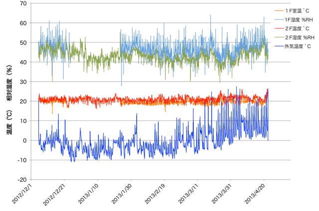 2012 年 12 月から 2013 年 4 月まで、1、2F と屋外に設置した温湿度測定装置で環境測定を したところ、全期間を通して1F と2F との温度差は1°C以下に維持されており、断熱性能の高 さを示していました。また、気になる温度変動は燃料補給をしていない夜間を含めておおむね 20°Cを維持。断熱性能に e-プラスターの蓄熱性能を組み合わせることにより、薪ストーブ1台 でも快適な住環境が維持できることが確認できました。木材の暖房エネルギー量を灯油に換算し て比較したところ、予測計算比で約 40%の省エネルギー効果が確認できました。 また、温度の安定と同時に室内の相対湿度も 40%を維持してインフルエンザなど風邪の原因菌 の繁殖を抑制。加湿器を使用しなくても、調理、入浴、洗濯乾燥などで生じた水分と e-プラス ターの調湿効果により、健康的な空気環境が維持されています。