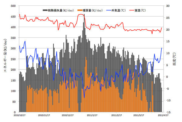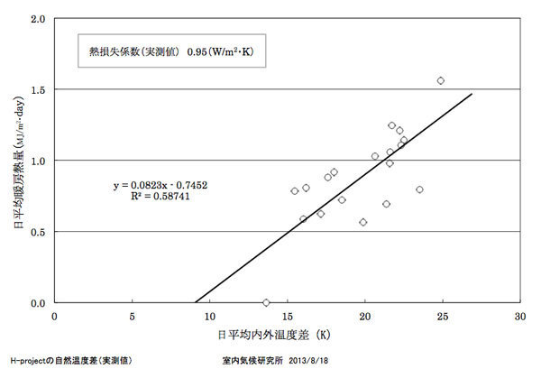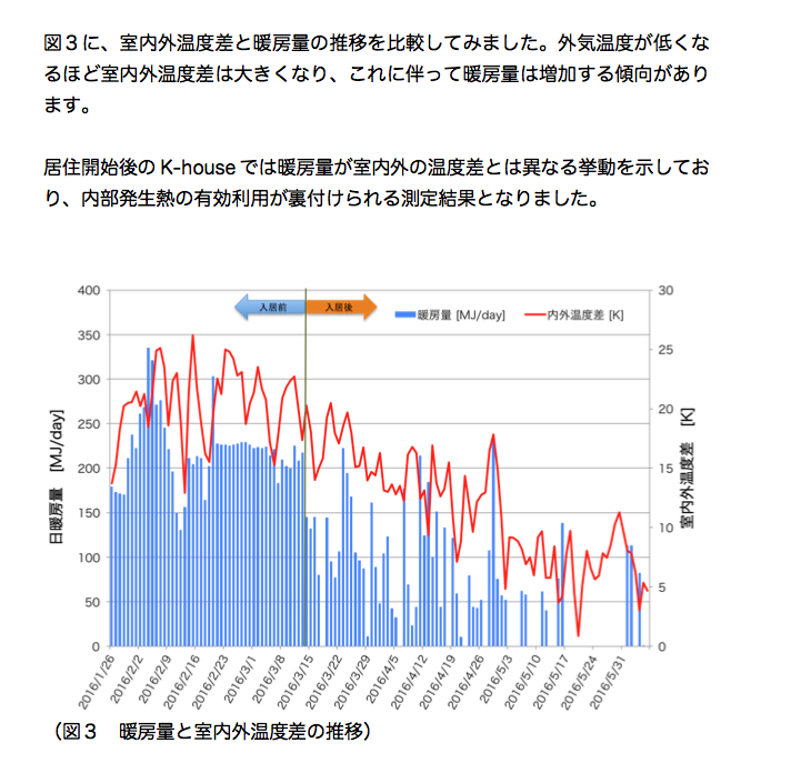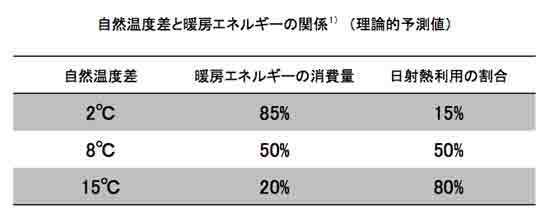 一方、H-project で確認された自然温度差の実測値は 9.05°C。全く暖房をしなくても、内部取得熱で室内の温度は外気温度より9°Cも高く維持されることになります。自然 温度差と暖房量に関する既往の知見1)によれば、自然温度差が8°Cの場合、暖房量は 50%削減されることが知られています。しかし、この知見は日中の太陽熱によって室 温が過度に上昇するような住宅は想定しておらず、熱容量が少ない実際の高性能木造 住宅ではパッシブソーラーの効果が十分に得られない場合も散見されます。