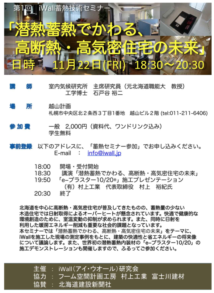 iWall 研究会は、2013 年 11 月 22 日(金)に「第 1 回 iWall 蓄熱技術セミナー」を札幌市で 開催いたします。高断熱・高気密住宅が普及した現代だからこそ可能になる、新たな省エネル ギー手法「iWall®」。潜熱蓄熱を応用した iWall 構法の特徴を、施工現場の環境測定結果から解 説。潜熱蓄熱内装材「e-プラスター®」の施工プレゼンテーションも実施いたします。ふるっ てご参加ください。