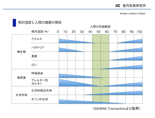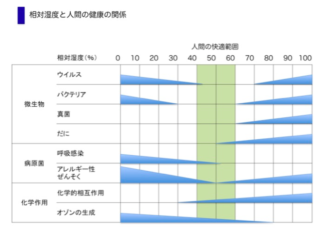既往の研究では、人間の快適性と健康にとって最適な相対湿度の範囲は40〜60%である事が明らかになっています。また、相対湿度が40%以下になると、ウイルスやバクテリアなどが非常に増殖しやすい環境となります。