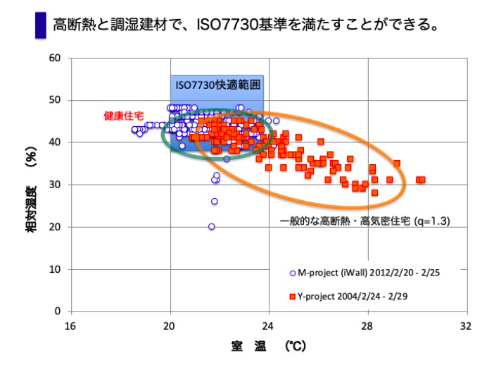 一方、「e−プラスター」を施工した住宅では、測定期間中ほとんどの時間でISO規格の範囲内に温湿度が維持されていました。「e−プラスター」の熱と水蒸気を呼吸する機能が、安定した温湿度生成に寄与した結果と考えられます。快適範囲の環境ではインフルエンザ菌の活動が活性化する相対湿度以上の値が得られていますので、「e−プラスター」の健康維持への機能が期待される訳です。