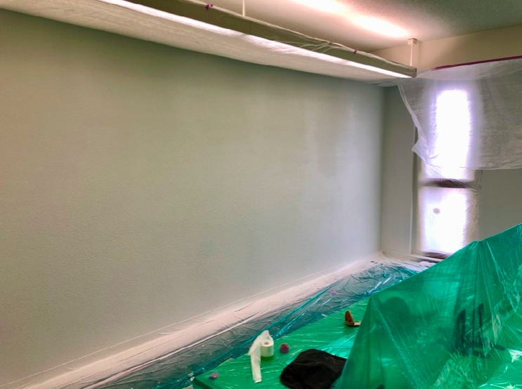 「抗菌リニューアル」工事を施工する室内の表面には、下地調整のためにカチオンシー ラーを施工しておきます。