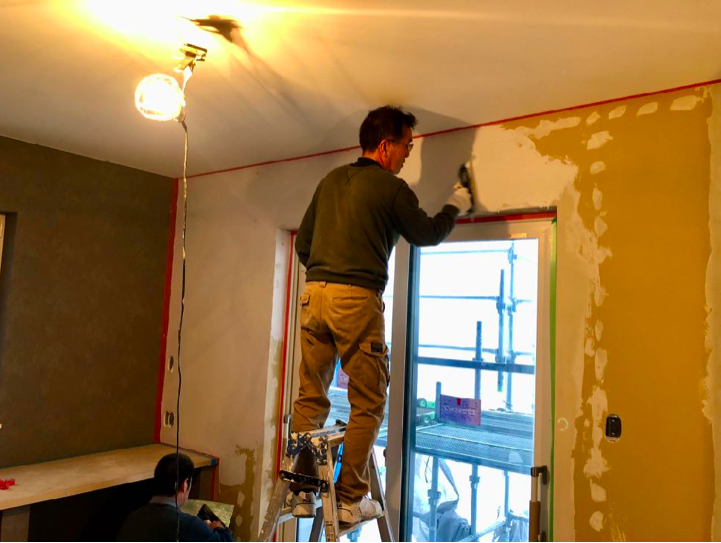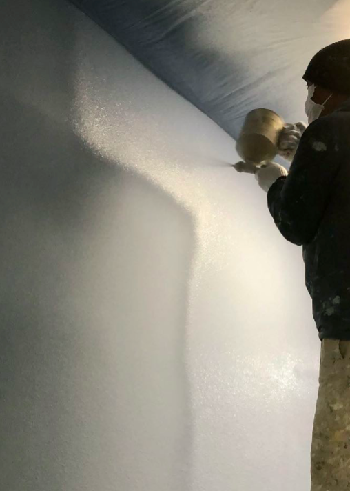 シーラー処理を施した表面の状態に合わせて加水量やローラーの選択を工夫しながら、 熟練の職人さんたちが、真心を込めて施工をしていきます。