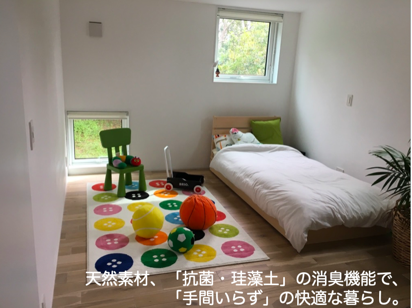 また、加湿器を使用していなくても相対湿度は40%をキープ。壁と天井に施工した「e−プラスター」の保湿効果で、安定した湿度環境が維持されています。小学生と幼児の二人のお子様も、全く風邪を引かなくなったそうです。