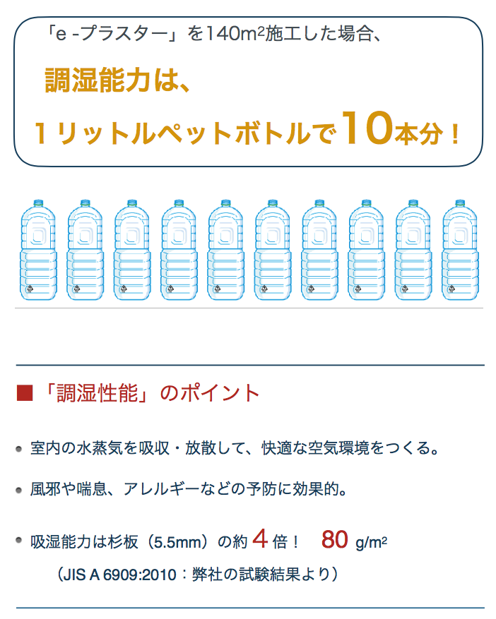 一般的な空気清浄機能付き加湿器のタンク容量は2~3リットルで すから、「e -プラスター」の調湿能力の高さがわかります。また、 給水や清掃などの手間がなく、自然に適切な調湿ができます。