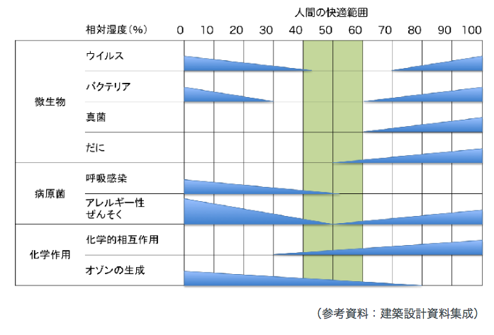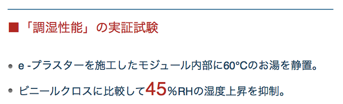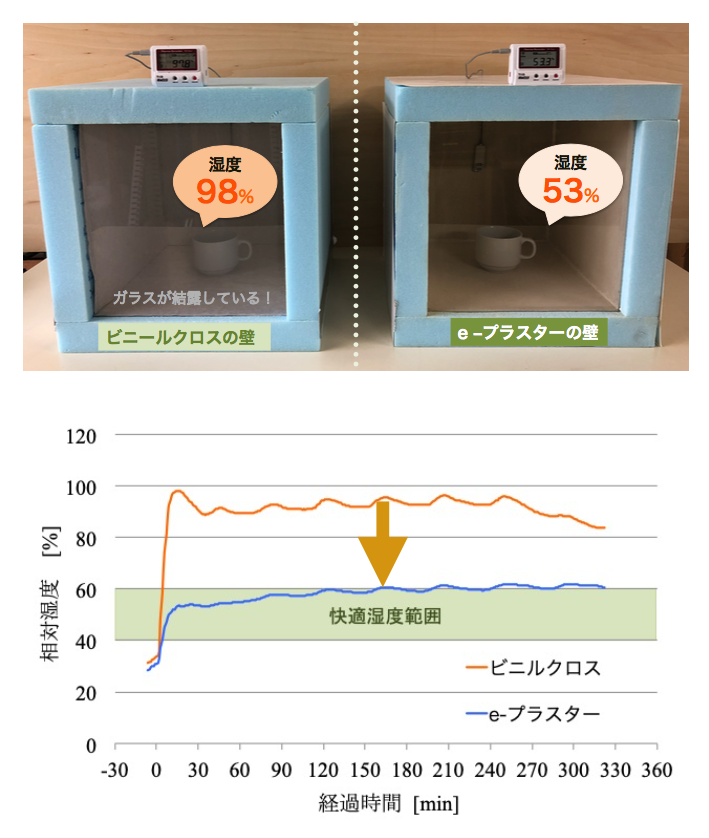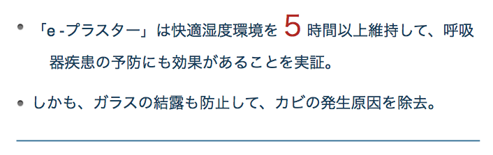 「e -プラスター」には湿度が高い時には室内の余分な水蒸気を吸収し、 湿度が低くなると放散する働きがあります。冬特有の呼吸器疾患の予防、 過乾燥による喘息、アレルギーの発現を抑制するとともに、結露を防止し ます。夏場にはジメジメを抑え、さらっとした快適な空気環境を作ります。