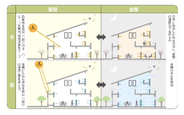 一方、暑い夏には夜間の冷涼な空気が持つ冷熱を、夜間に吸収して 蓄積。日射遮蔽技術と組み合わせることで、気温が高くなる時間帯 でもエアコンに頼らず、涼しく過ごすことが可能になります。