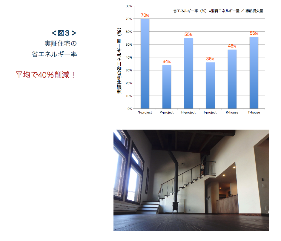 札幌市内の実験住宅では「iWall構法」の採用により熱損失係数(Q 値)が0.73 [W/m2K]とほぼ半減しました。内部取得熱による自然 温度差も10.2°Cで、一般的な高断熱・高気密住宅(5°C程度)に比 べて約2倍に上昇することも確認できました。また年間の暖房エネ ルギー消費量は約40%削減!「iWall構法」の省エネルギー効果は、 GWの400mm追加施工に匹敵します(弊社実測結果より推定)。